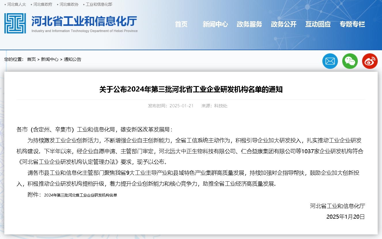 2025年1月21日,河北省工業和信息化廳發布了《關于公布2024年第三批河北省工業企業研發機構名單的通知》。經主管部門審定,河北子曰機械設備有限公司作為企業研發機構符合《...